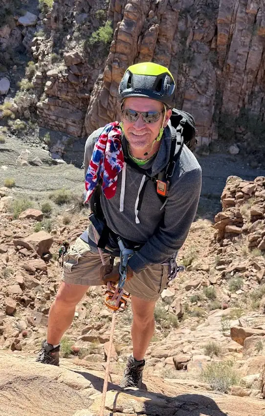 Chris is expanding his canyoneering skills on every outing and is comfortable rappelling.